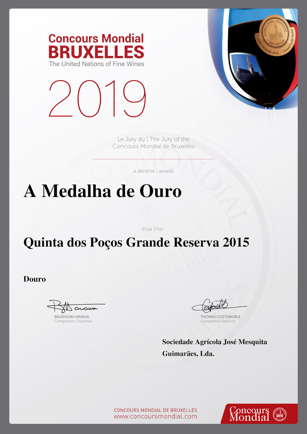 Na 26.ª edição do Concours Mondial de Bruxelles, que decorreu em Aigle, Suíça, entre 2 e 5 de Maio de 2019, o Quinta dos Poços Grande Reserva 2015 obteve uma Medalha de Ouro